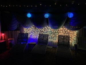 Power-washing cushions and furniture wasn’t much fun, but it was made better with music blasting and imagining how nice it’ll be to share the space with loved ones. I also hung colorful sarongs and glowing paper lanterns. I wish the photo captured how magical it feels (click to see it enlarged).