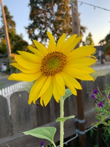 We planted a handful of Mammoth Sunflower seeds in our garden a few months ago and today we discovered our first lovely flower! We’ve got nearly a dozen eight-foot-tall stalks that are about to flower and we are very excited. Our first yellow bloom is about the size of my hand.