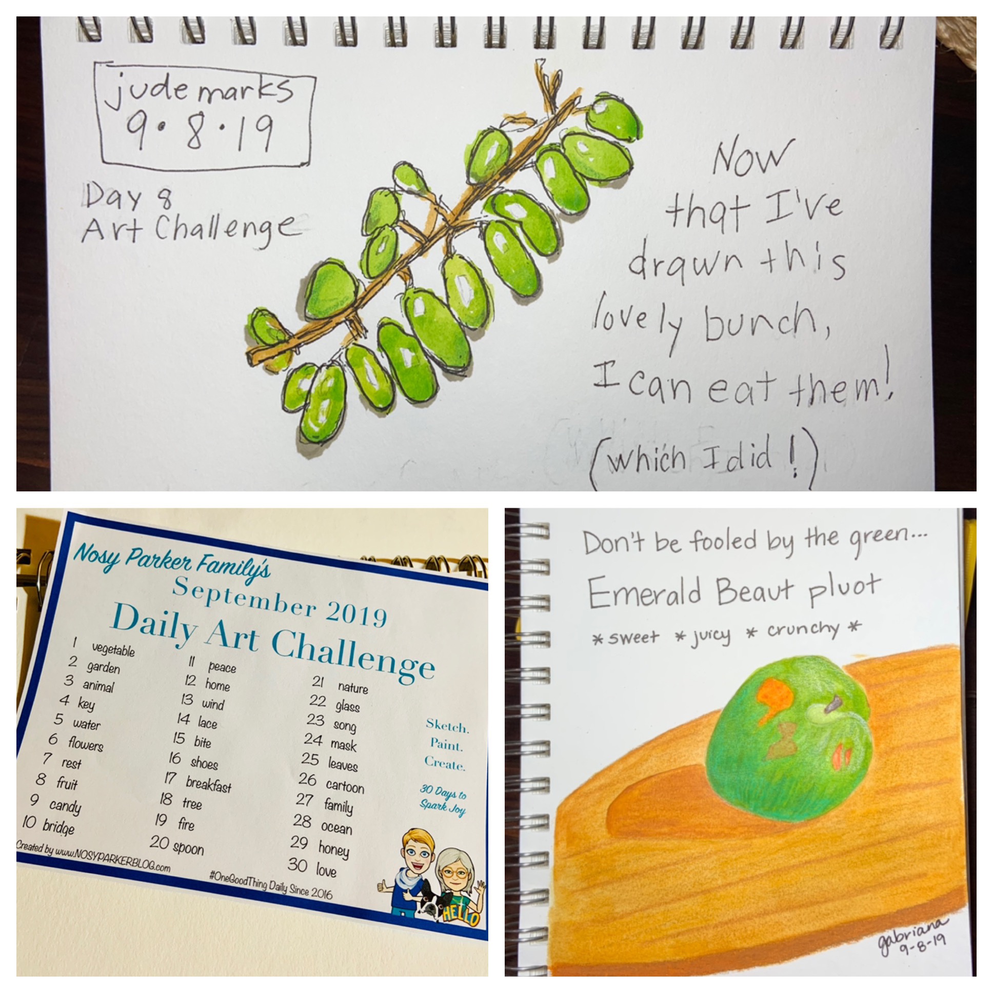 It’s Day 8 of our September Art Challenge and the inspiration/prompt for today was fruit. Since we picked up a large bag of our favorite bright green Emerald Beaut pluots at the farmers market yesterday, I thought it was perfectly timed for today’s art piece. Mama did this glorious, charming and lifelike drawing of green grapes, which she then ate!