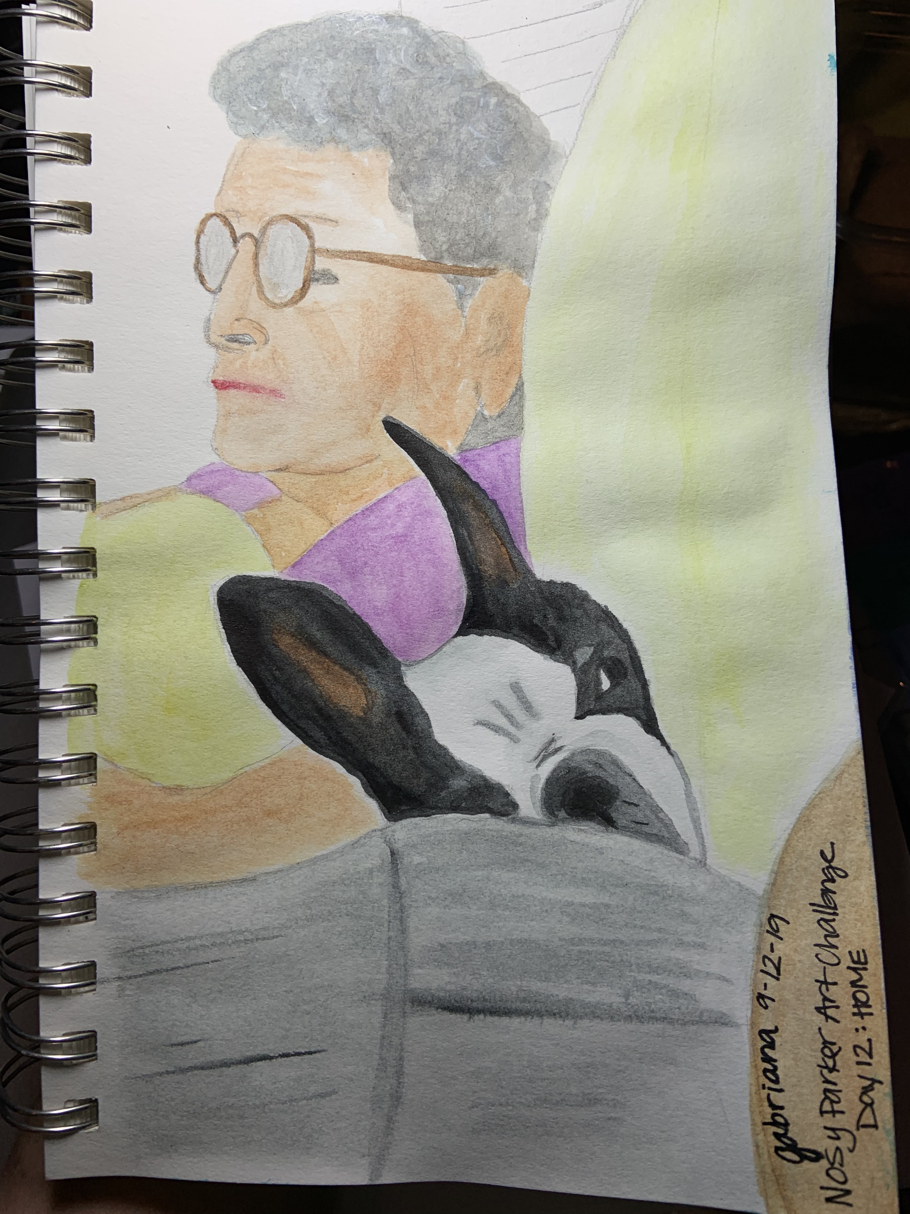Since I’d already drawn our actual home on an earlier day, I decided to creatively interpret Day 12 of our Art Challenge. Mama and Paisley are home to me, and so I drew a scene with them.