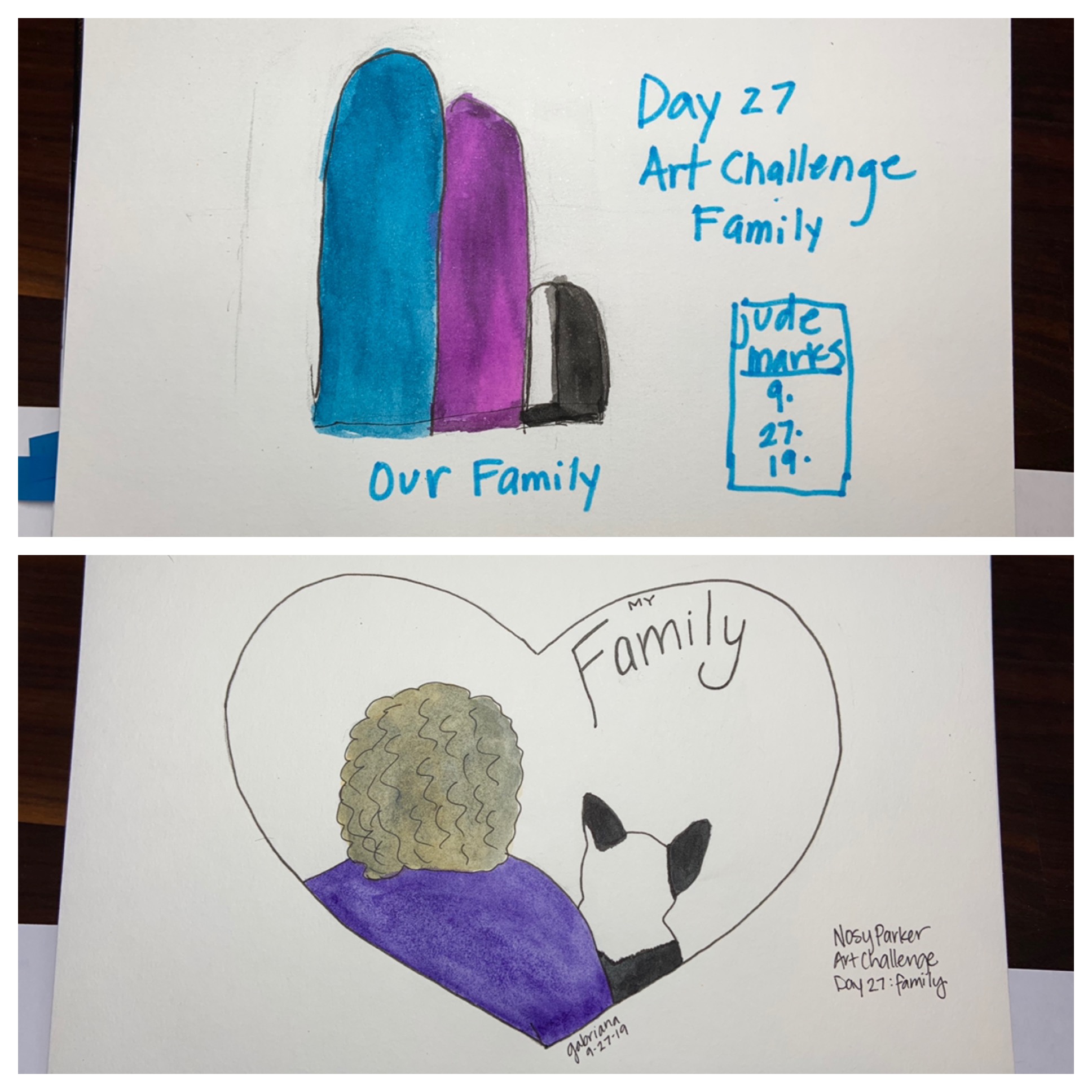 After a Friday filled with visitors, Mama and I sat down and did our Nosy Parker Daily Art Challenge. The inspiration/prompt was family and so we each painted a family portrait.