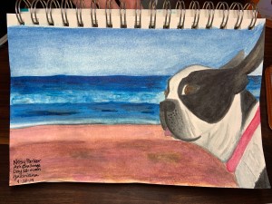 I drew a scene of our beloved Boston Abby at the beach in Santa Cruz. Mama painted a wave with gorgeous shades of turquoise.