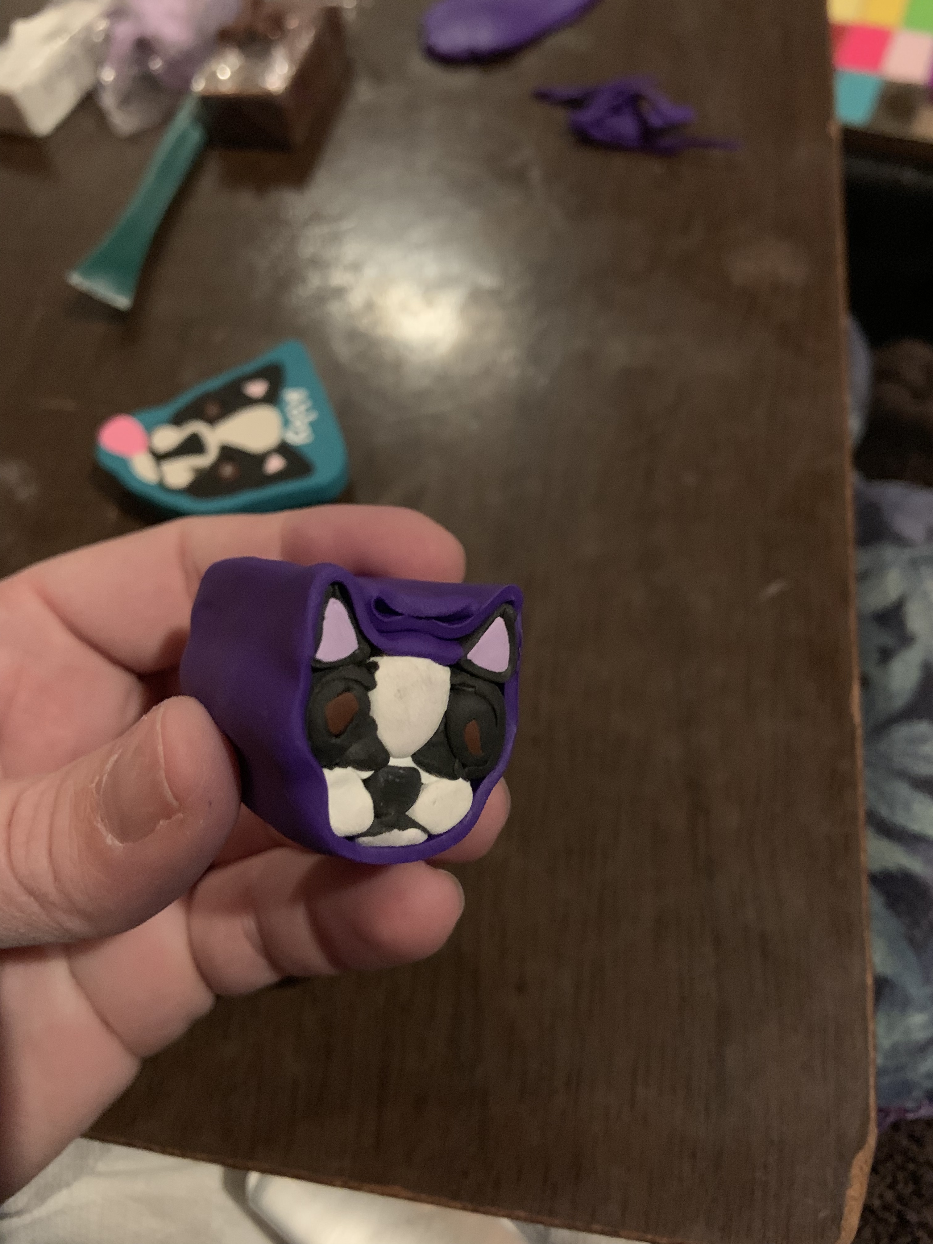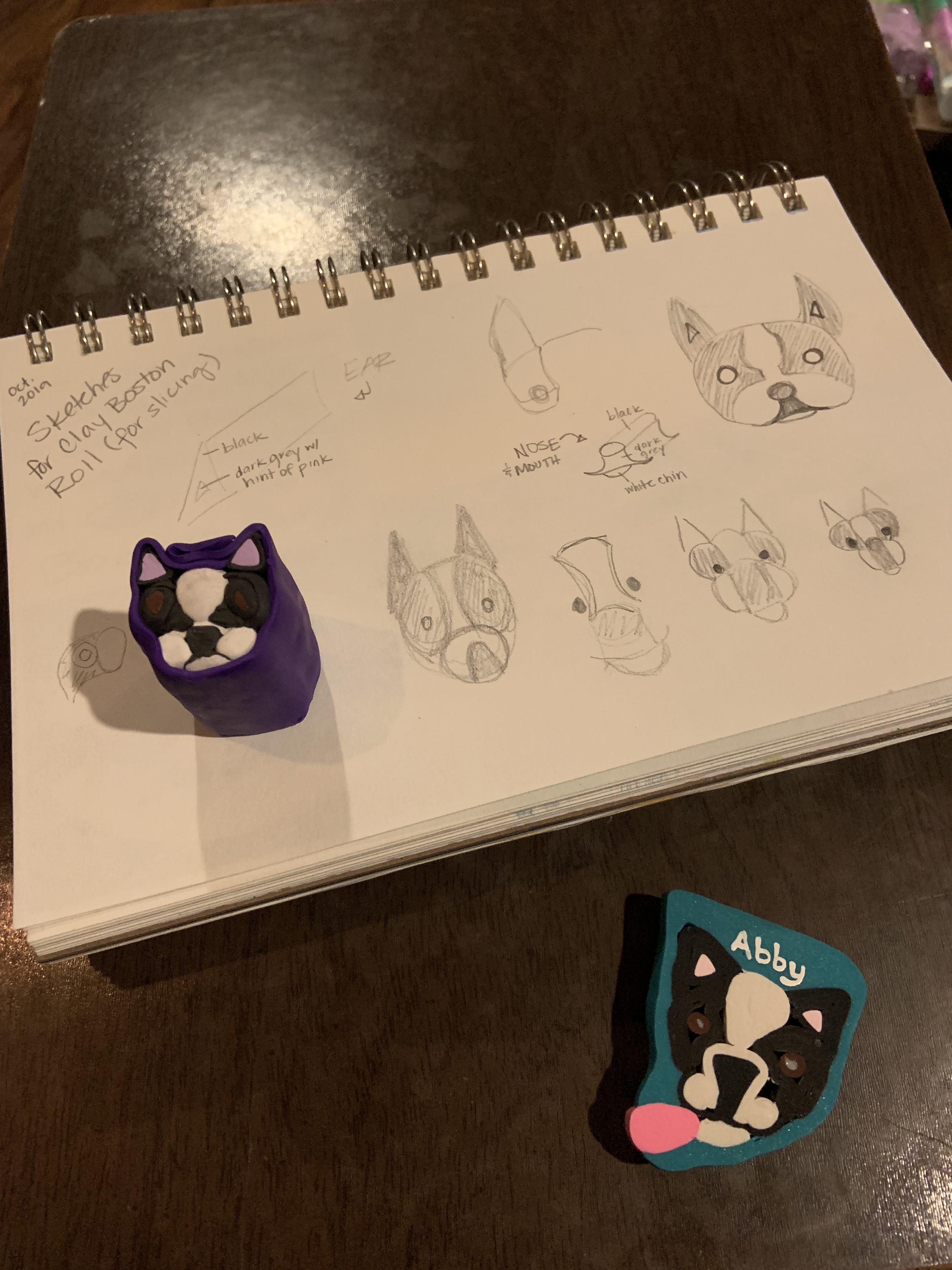 Today I was reunited with colored clay and created a new cane (like a sushi roll that you slice) of a Boston Terrier. I’m waiting for the clay to firm up slightly before I slice and bake it, but I like how it turned out so far.