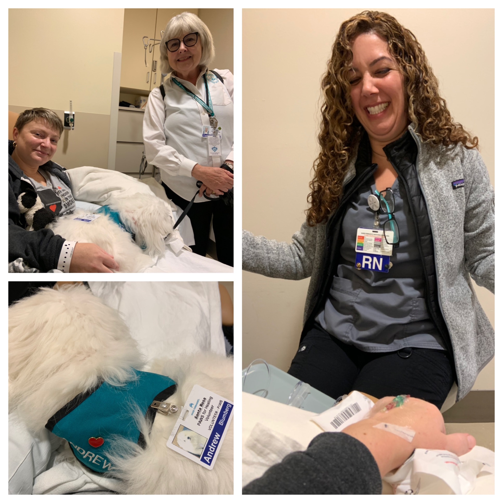 For the last few months, I’ve been especially lucky to get a visit from a sweet, fluffy dog named Andrew and his kind human, Pam. Seeing them always makes this dreaded and long day a little better!