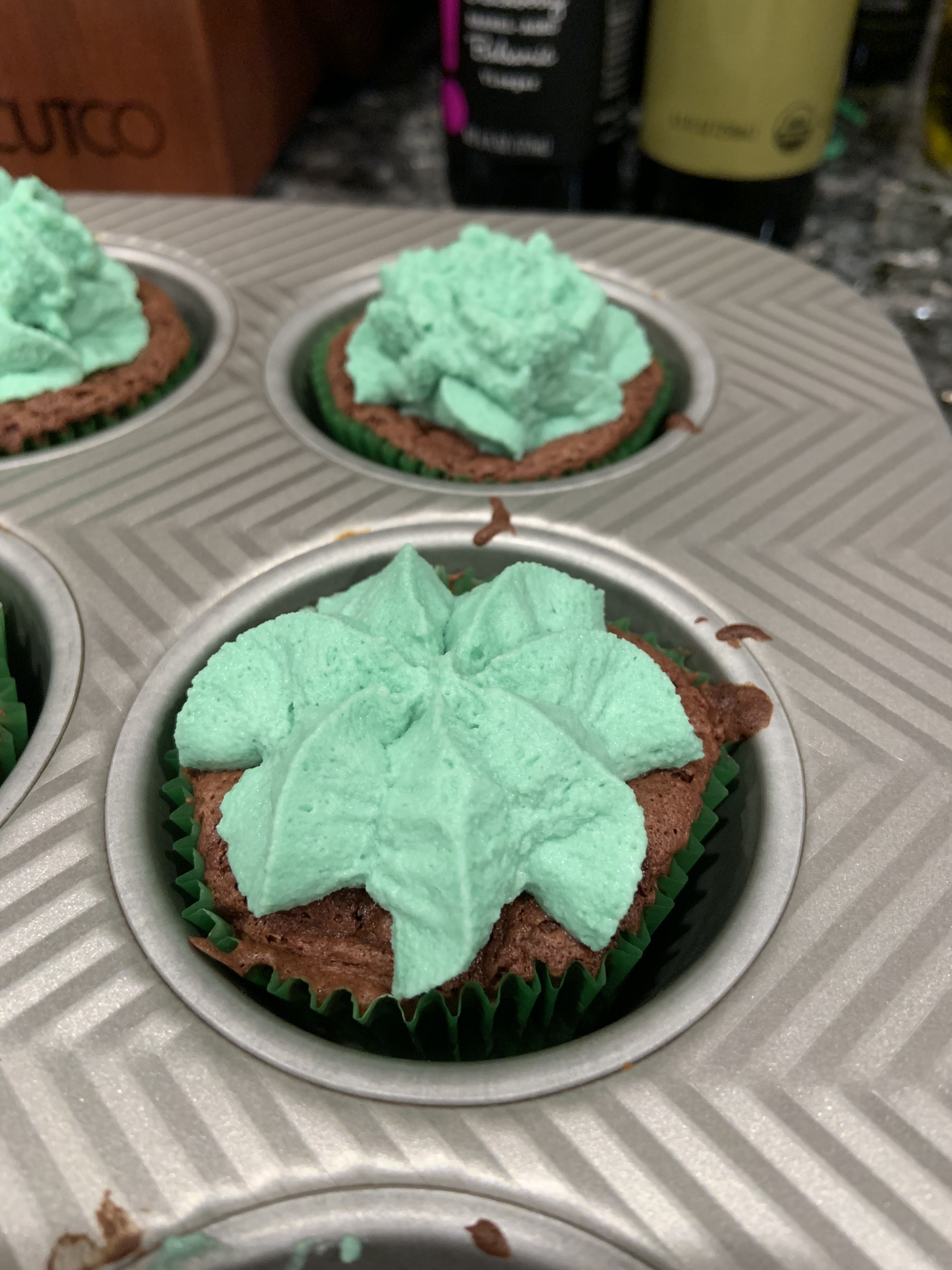 In gratitude to our evacuation hosts, I made chocolate soufflé cupcakes with mint cream this evening. Yum!