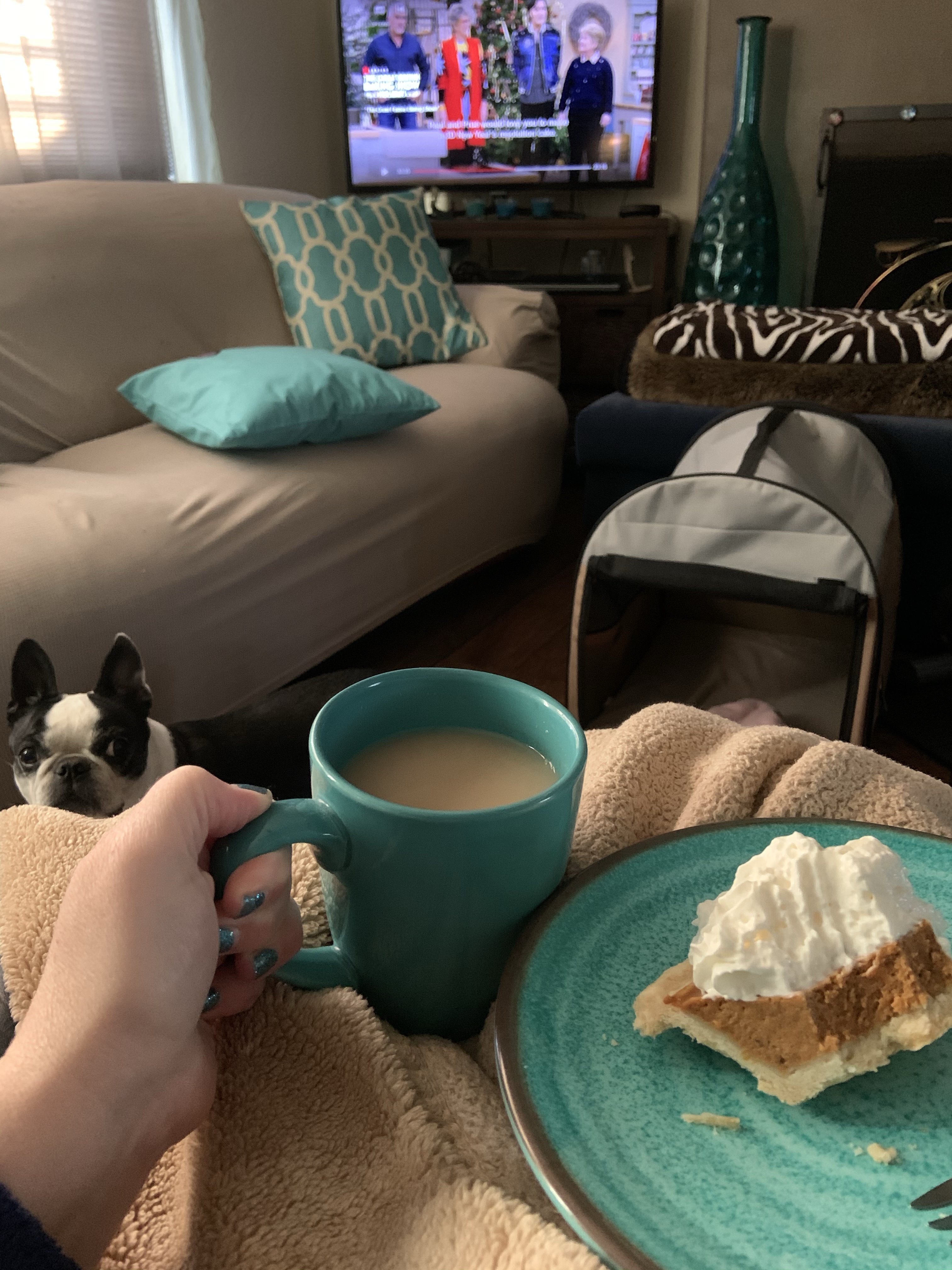 Today’s #OneGoodThing with Mama was enjoying large mugs of English Breakfast tea, pumpkin pie with whipped cream, and the British Baking Show Holidays! Plus, our adorable photobomber Paisley makes everything better! What was your #OneGoodThing today? Please share in the comments! Kindness is Everything.