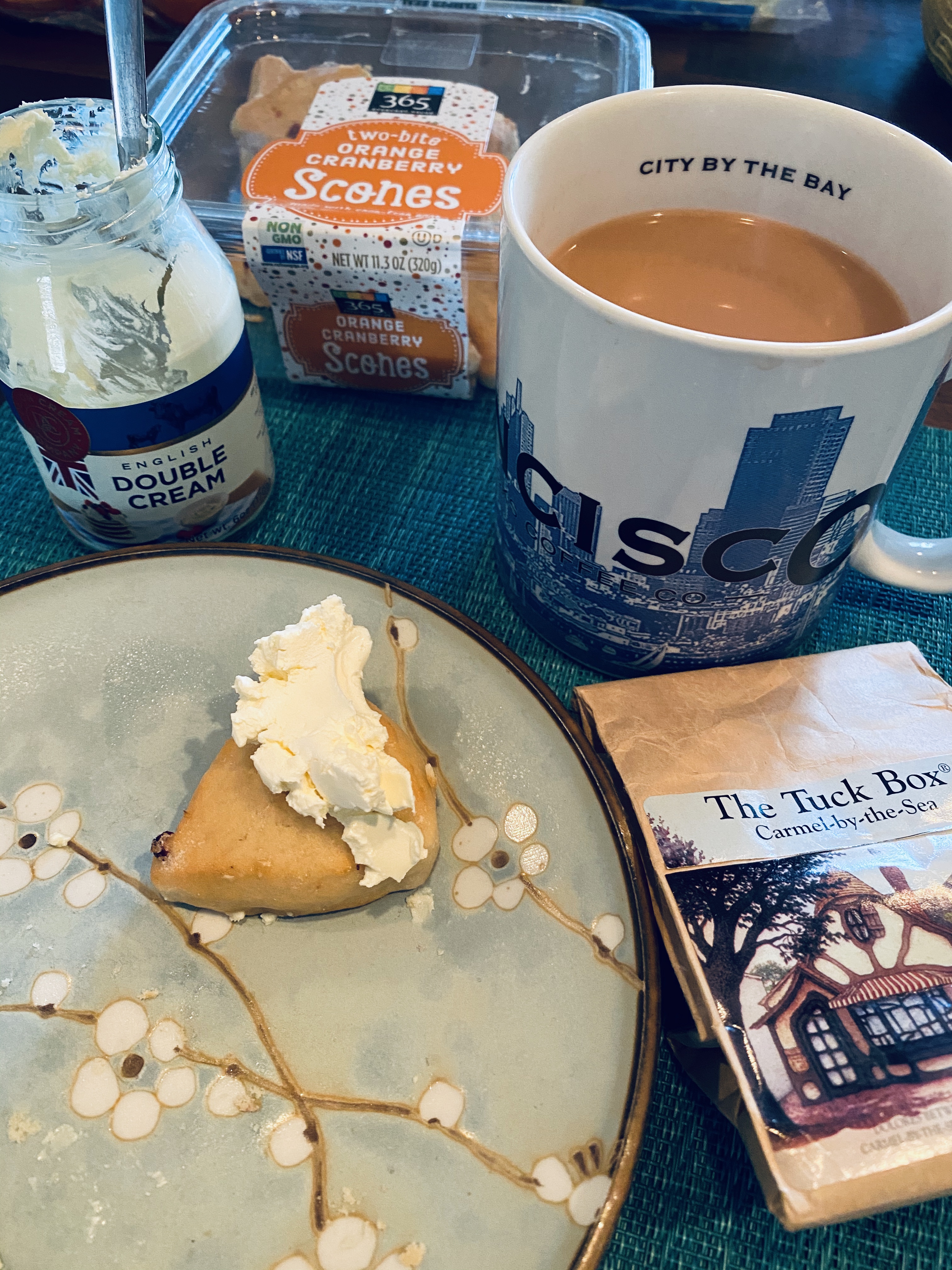 This morning, I surprised Mama with a special little brunch: British Double Cream (couldn’t locate clotted cream—yet!) over mini cranberry orange scones and French-pressed English Breakfast Tea from a little tea shop we adore in Carmel-by-the-Sea. We savored every bite and giggled over how terribly suggestible we are!