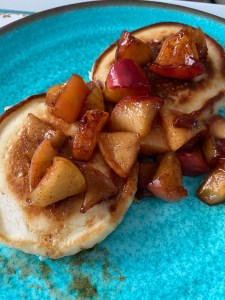 Just like Antoni did on the show, I cooked up apple chunks in butter, cinnamon, and maple syrup. It was the perfect topping to our flapjacks and so tasty!