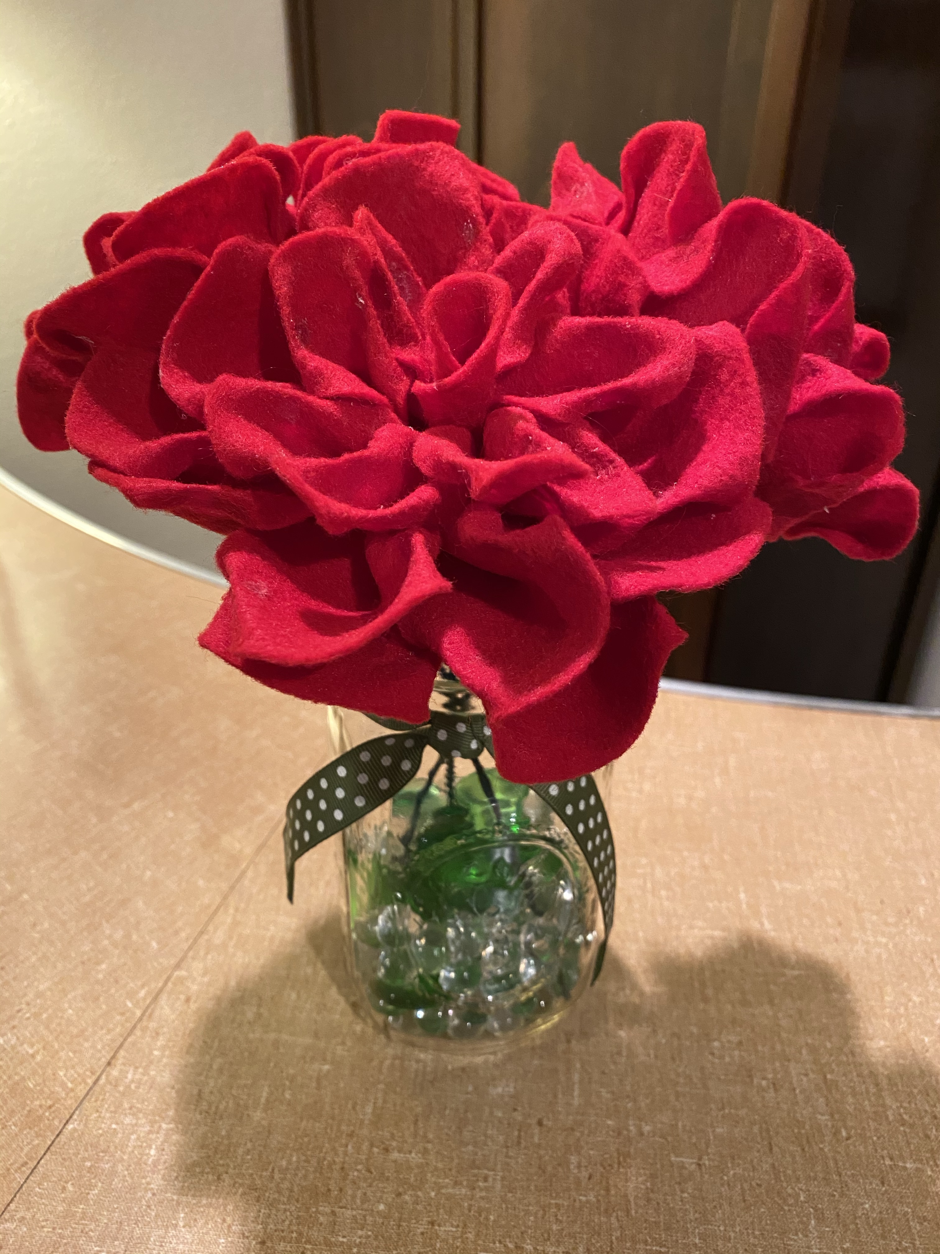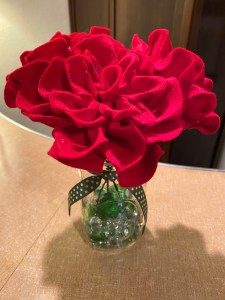 I’ve been cutting out and gluing red felt fabric into more than 800 rose petals for weeks now (an excellent post-surgery activity). I finally stopped my assembly-line style work to finish the first prototype and I’m so pleased. They’ll be beautiful at our annual summer garden party celebrating Mama’s triumph over brain cancer.