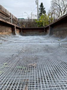This project has taken months—first removing the arches and lights and then most of the soil from the planter, before cutting and securing the wire to fit inside with stakes and staples. I finally completed these last steps today and began replacing all the soil on top. There’s still some soil to shovel back in, but I made good progress.