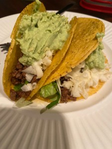 I threw them together with the leftover taco meat I’d cooked on Taco Tuesday and smashed up a fresh avocado for the guacamole. Mama’s tacos were more colorful with salsa (I’m avoiding tomatoes at the moment), but she was too hungry for photos.