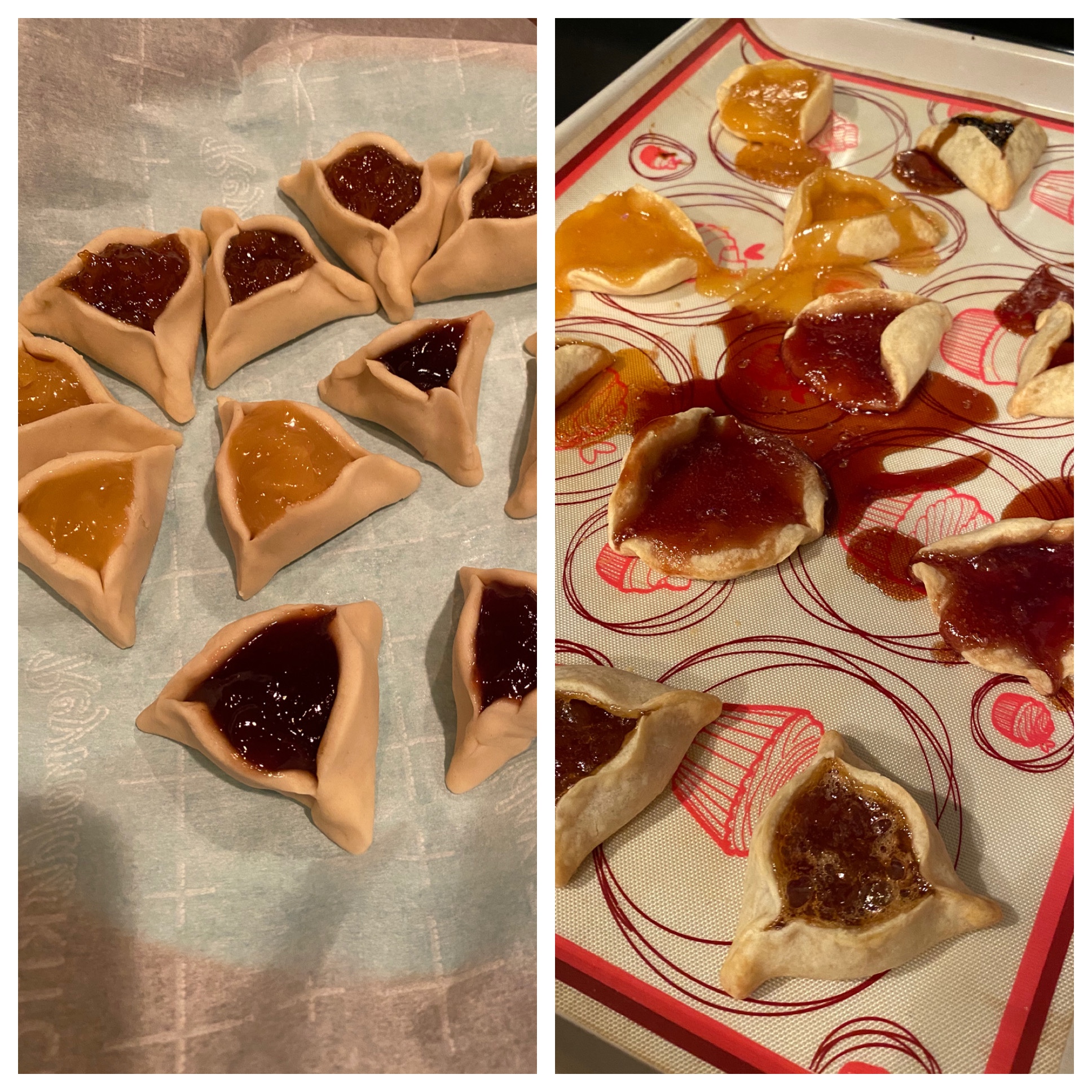 We enjoy filling our three-cornered cookies with various jams and spreads. As you can see by my disaster of a baking sheet, all but one of them exploded! They tasted great anyway.