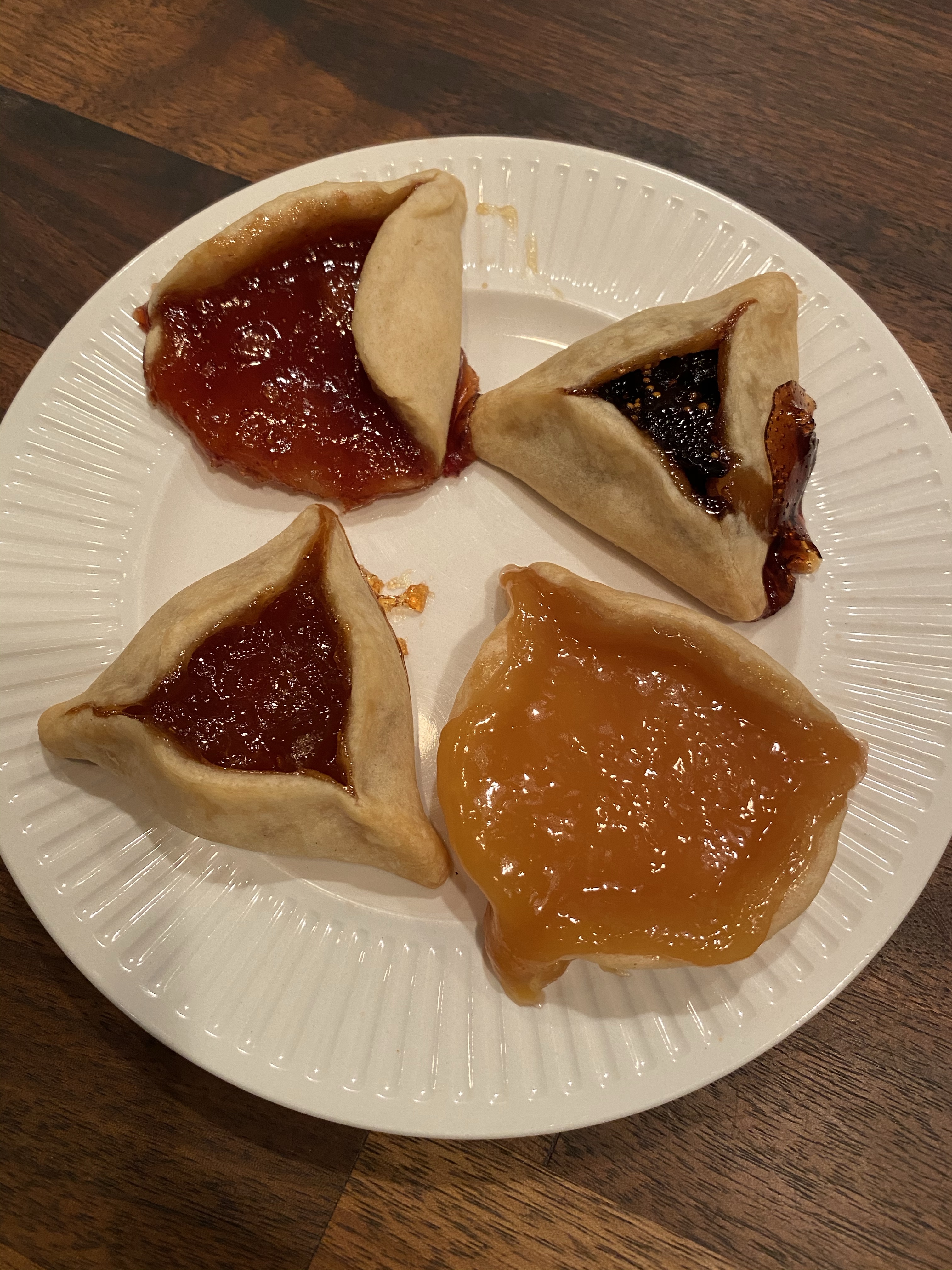 These are “lazy” Hamentashen because I didn’t make the proper dough like last year; instead, I used a frozen pie crust! I know, gasp!