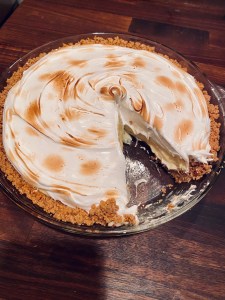 Quarantine meals are starting to get creative as we eat up our supplies. Thankfully, we have a small lime tree in our backyard. I was thrilled to find everything else I needed in our pantry and fridge. I decided to mash up two different SmittenKitchen recipes—one for the graham cracker crust and lime filling, and another for the toasted marshmallow. Though I’m sure the flavors will be even better tomorrow when it sets properly, it was delicious!