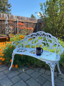 The afternoon’s warm sunshine urged me out into the garden for a coffee break. The fresh air and blue sky were delightful and I enjoyed a chai tea latte in my old KNX1070 Newsradio mug (from my first job in news writing).