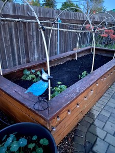 Gophers previously breached the wire at the bottom of our garden box and ate several of our plants, destroying our cucumber crop entirely. In January, we disassembled the arches and shoveled all the soil out, secured new gopher wire down, and then replaced the soil in the garden box.