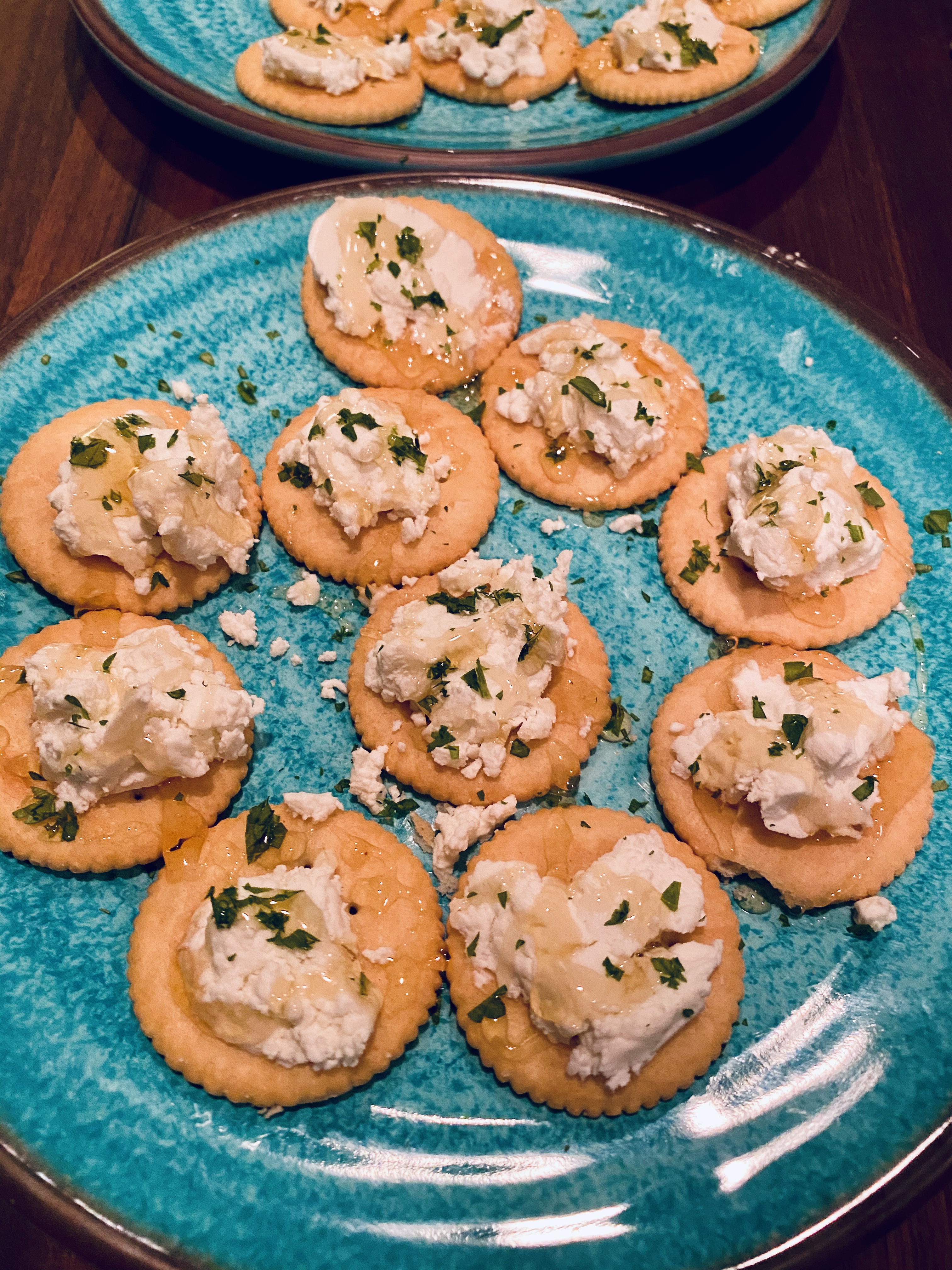 This delicious appetizer-turned-dinner is one of our favorite combos: soft goat cheese topped with fresh, chopped parsley and honey. The tangy and sweet mix pair beautifully with the bitter herb.