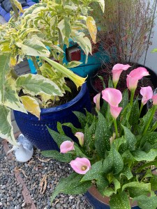 Mama and I discovered our pink calla lilies in bloom this evening—as well as our very first Angel Trumpet flower bud of the season!