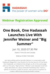 Mama and I logged onto Zoom to see my favorite author—Jennifer Weiner—appear on the top of the screen, above the event leader from Hadassah.