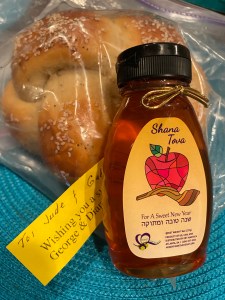 An amazing Rosh Hashana care package arrived in the mail for us today—complete with homemade round challah and a cute bottle of honey (traditional for a sweet New Year)!
