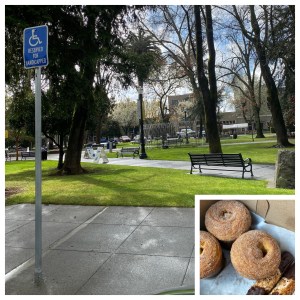 We took a little drive about 20 minutes north to the town of Healdsburg. There we picked up pastries from a bakery whose farmers’ market booth is always our first stop. Mama and I enjoyed this view of the town square park from our car while we gobbled our treats. The weather was finicky—rain, hail, and sunshine all while we sat there!