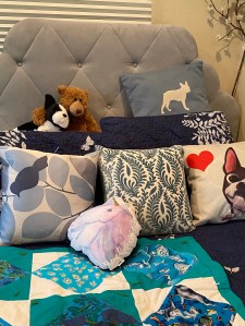 This adorable little scene on my bed warmed my heart today. Can you spot the stuffed bear comforting the dog?