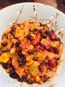 I’ve been making this delicious Chunky Vegetarian Chili for more than a decade after first enjoying it at a friend’s book club. The recipe calls for three different kinds of beans and two different bell peppers. We’ve previously paired it with corn bread. This time we added a dollop of sour cream. Yum!