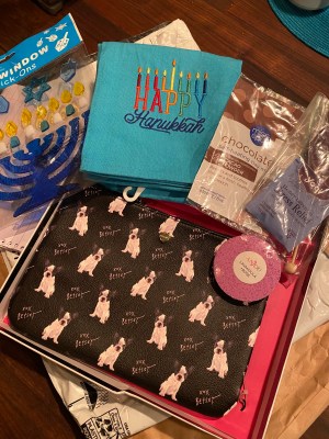 Heather sent me a box filled with a few self care items, Chanukah decorations, and a beautiful Boston Terrier clutch purse. I love all of it and was so touched by her kindness!