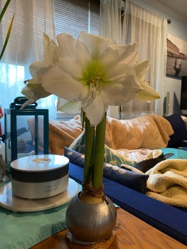 Our little winter garden is in full bloom right now with four beautiful white Amaryllis flowers on one stalk.