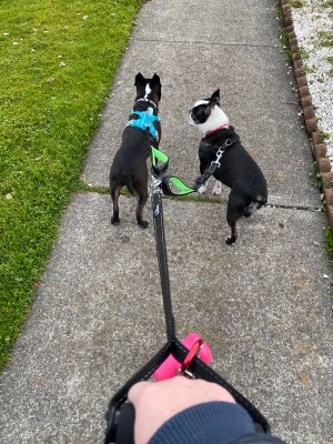 Mama and I took the dogs on a pleasant walk in our neighborhood this afternoon. We enjoyed the fresh cool air and some flowers, but the best part was this wonderfully strong new leash we got with a splitter that keeps the dogs from getting tangled and an ergonomic handle for me.