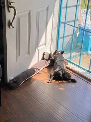 Our sweet little Benny has discovered our Boston Terrier doorstop/draft guard and decided it is his new friend. They shared a lovely sprawling cuddle in the sunlight coming through the front door today.