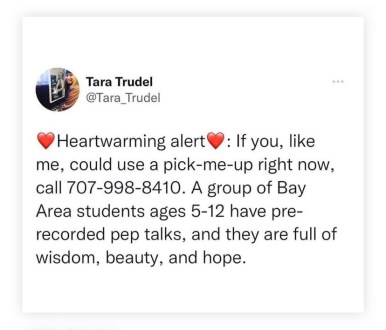 I saw this heartwarming alert going around on social media, but didn’t actually call the pep talk hotline until my best friend texted it to me this afternoon. This is the sweetest thing and helped brighten our day immensely.