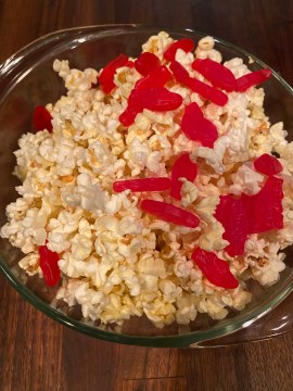 Mama and I weren’t hungry enough for an actual dinner, having exhausted ourselves on decluttering this afternoon. So we decided to celebrate our completion of today’s tasks with our favorite combo of popcorn with Swedish fish!