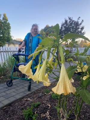 The Angel’s Trumpet in our front yard is thriving and has NINE flowers right now. These are Mama’s favorite flowers and she is beyond thrilled!