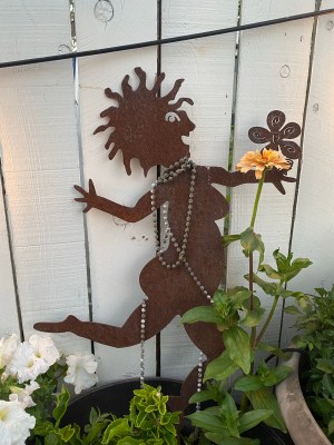 This lovely yellow zinnia appeared inside the edge of this pot, volunteering itself at exactly the right spot so it looks like the dancing woman is holding it. We love how this statue and her beads have weathered the years.