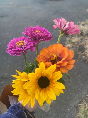 I needed a way to improve my mood so I decided to focus on doing something nice for someone else. I picked these pretty zinnias and sunflowers along with a bag of produce from our garden and brought them to our beloved neighbors. It was wonderful to see them and share our harvest!