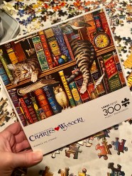 We found this interesting 300-piece, cat-asleep-on-a-bookshelf design online and it arrived the next day. I set it up on Staten (our kitchen island) next to her automatic medication dispenser and she gets sucked into the fun of puzzling at least twice a day! It’s so hard not to puzzle with Mama, but what a thrill to see her joy with it!