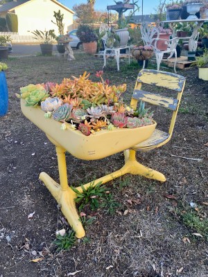 On a neighborhood walk with the dogs this afternoon, I spotted this wonderfully cheerful child’s desk turned succulent planter. It was so cool that I had to stop and take a photo.