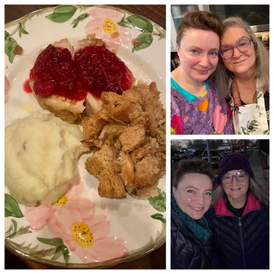 Mama and I donned treasured aprons and cooked our brined turkey breast together today.