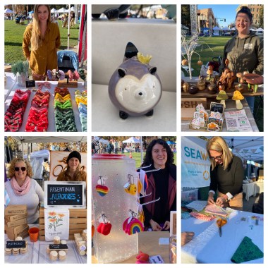 Clockwise: Dog Bow Ties by The Woof Gang, Adorable Ceramics by B Van Soi, DIY Mini Moss Wreath with Moss & Mush, DIY Dog Bandana with Sea Woof, Felt keychains by Felt Flanerie, and Argentinian Alfajores by Amapolabites