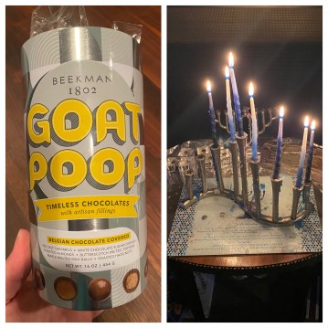 A friend stopped by with a Chanukah gift of delicious “Goat Poop” for us today. Don’t worry, it’s not actually a tin of poop. It’s fancy chocolate balls with six different artisan fillings like sea salt caramel and maple malted milk balls. And they’re addicting!