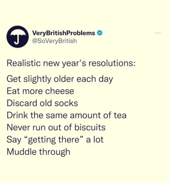 I like the ‘Realistic New Year Resolutions’. But I have a drawer full of old socks. My wife mentions them Now And aGain (Clue). But I reckon, if there is a hole where the material has worn through, that’s no reason to throw the whole (!) sock away. 95% of it is still perfectly good.