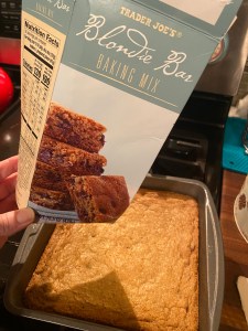It’s been a rough few days with water damage from the storm and pain in my joints. Mama and I decided we needed a warm, baked, chocolatey treat stat. And so I found this Trader Joe’s Blondie Bar box mix and whipped it up! Delicious!