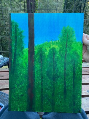 During my recent respite, I painted the serene wooded view from where I stayed. I loved how the afternoon light illuminated the trees in the distance. Many hours passed taking in this lovely scenery. I spent days trying to capture it in photos and then with acrylic on canvas.