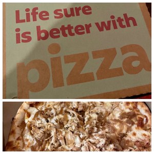 After working hard to clean up the overgrown and dead garden, we needed an easy meal and a special treat. We got our favorite Tuscan Chicken Pizza takeout from Mary’s. It was delicious and the box was cute too!