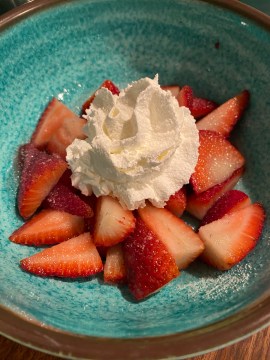 Our first strawberries of the season needed a little help in the sweetness department. A sprinkling of sugar and a dollop of whipped cream did the trick. Mama and I made a feast of it!