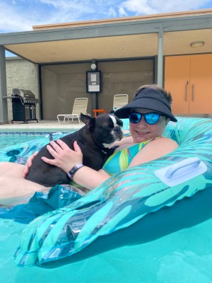 Floating is one of my favorite ways to rest, especially when the weather is hot. And with a large, mostly deserted swimming pool where we’re staying, Benny got to take a quick dip too! Many thanks to the nice Canadian couple who encouraged us and took the photo.