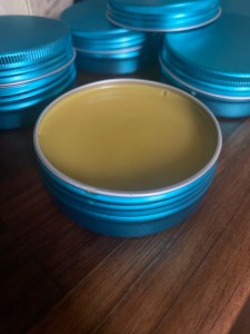 I used two of my favorite self-care, pain-relieving products as inspiration. I combined healing herbs grown in my garden with essential oils and shea butter. The result is creamy, soothing, calming, moisturizing, and pain relieving! I’m still working on the scent profile, but I’m really proud of how this first test batch came together. And I love these gorgeous turquoise tins!