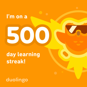 Mama and I each reached the 500-day milestone with Duolingo! We both started with Spanish, but I switched to Hebrew several months ago.