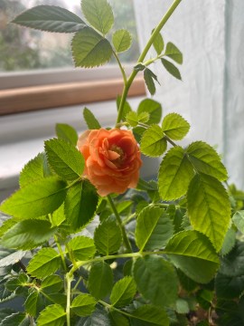 This miniature rose bush came from Trader Joe’s with cute little pink flowers. I wasn’t sure if it would live past that initial blooming. But behold, a cute, tiny peach-colored rose has appeared to brighten my spirits.